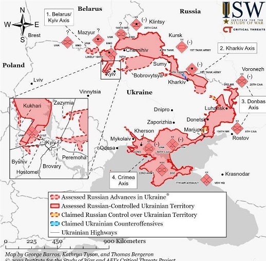 ISW指出,俄军在基辅北部及西部进行部署,西部有多达18个营级战术群,但俄军在过去24小时内并未发动重大行动,仅在基辅西方的伊尔平一处平民疏散走廊进行攻击,炮及一座桥梁及用于疏散平民的铁路。