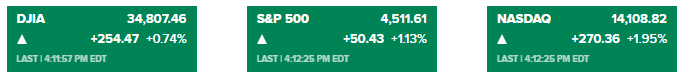 道琼斯指数收涨254.47点,至34807.46点,涨幅0.74%。标普500指数上涨1.13%,收于4511.61点。纳斯达克综合指数上涨1.95%,收于14108.82点。