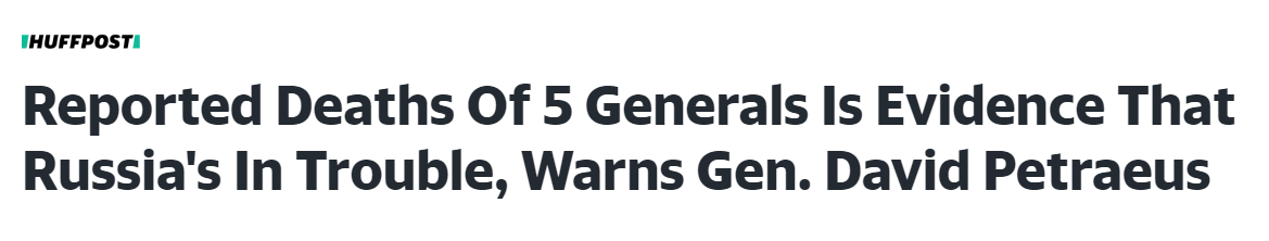 截至目前为止,克里姆林宫只承认苏霍维斯基的死讯。如同美国退役陆军上将裴卓斯20日告诉美国有线电视新闻网(CNN),将领在任务中阵亡“非常非常罕见”。担任过美国中央情报局(CIA)局长的裴卓斯指出:“开战只过去3周时间,且这些人是相当高阶的将领。”
