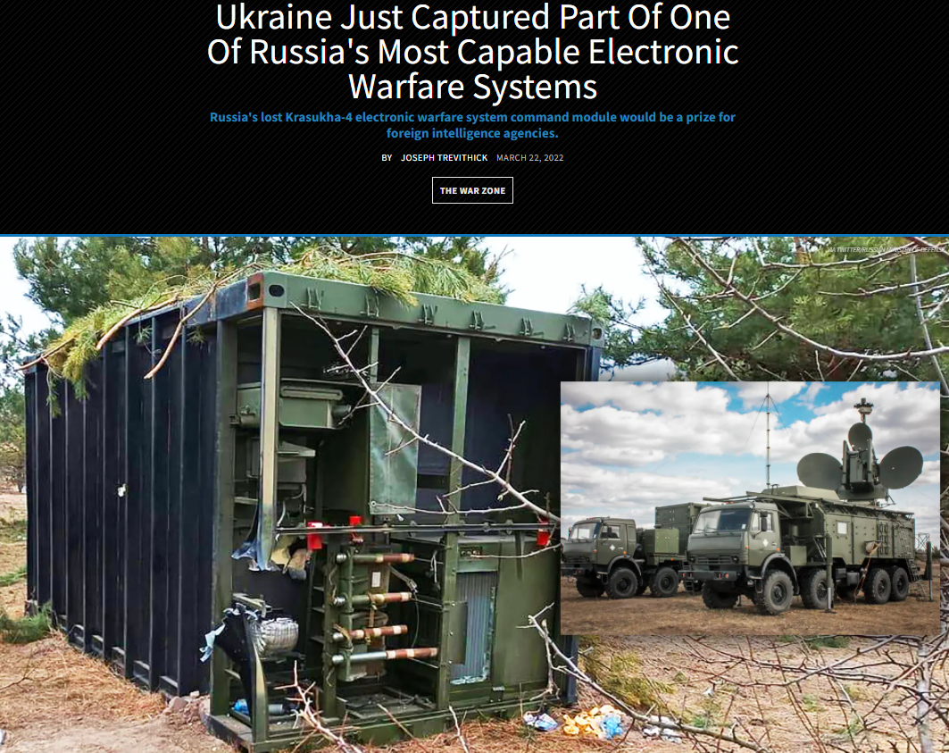 乌军掳获Krasukha-4的指挥模组后,将可以为乌克兰当局及其外国合作伙伴提供大量情报来源,对俄军来说也会是军事情报的重大损失。