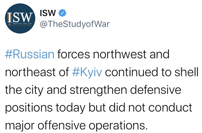 据英国广播公司(BBC)报道,ISW指出,位于乌克兰首都基辅东北及西北部的俄军,持续炮轰基辅,并强化防御阵地,但并未执行重大的进攻行动。