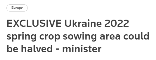 乌克兰在2021年收成创纪录的8400万吨粮食,预计向外国出口6500万吨粮食,其中包括2530万吨小麦和4000万吨玉米。乌克兰农业谘询公司APK-Inform表示,2022年度小麦出口量预计不会超过1830万吨,3月到6月大概只能出售20万吨小麦。