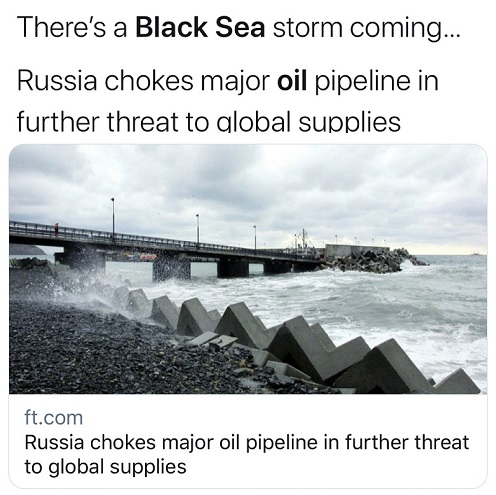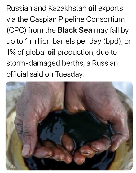 FX168财经报社(香港)讯 俄罗斯官员表示,暴风雨造成连接黑海和里海的油管设备受损,可能导致俄罗斯和哈萨克斯坦的石油出口减少100万桶/天,相当于全球石油日产量减少1%。