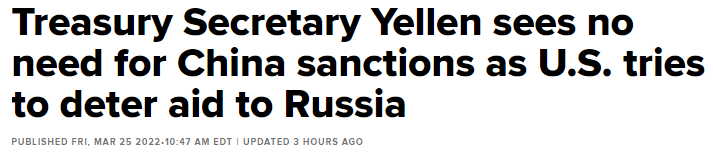 FX168财经报社(北美)讯 周五(3月25日),美国财政部长耶伦表示,她不认为美国应该因为中国与俄罗斯的关系而对中国实施制裁。