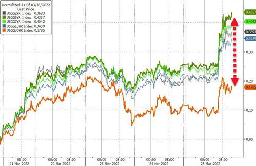 债券市场的“血洗”使得短期收益率飙升,5年/30年期美债收益率已非常接近反转(这将是2006年5月以来的首次),周五一度只相差1.3个基点。