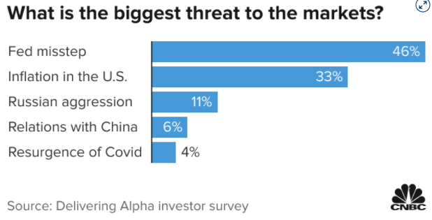 FX168财经报社(北美)讯 周三(3月30日),美国全国广播公司财经频道(CNBC)最新公布的Delivering Alpha投资者调查显示,多数华尔街投资者认为,目前市场面临的最大威胁是美联储的政策错误。美联储正在努力遏制数十年来的高通胀。