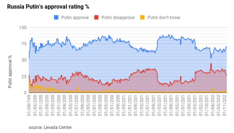 今年2月,随着他在乌克兰边境的集结进行,但在入侵开始之前,普京的支持率上升到71%。