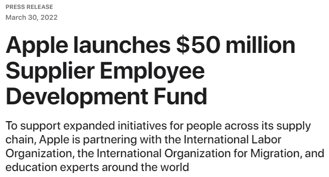 FX168财经报社(北美)讯 周三(3月30日),苹果(Apple)启动了5000万美元的供应商员工发展基金(Supplier Employee Development Fund),以扩大全球供应商员工的学习和技能发展机会。这似乎是为了应对2020年班加罗尔附近纬创资通(Wistron)工厂发生的类似事件。它还将创建新的项目、培训和员工反馈机制,以帮助确保整个供应链的员工拥有一个安全、尊重的工作环境。