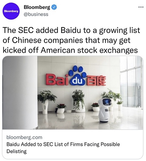 FX168财经报社(香港)讯 美国证券交易委员会(SEC)当地时间周三(3月30日)将包括百度、爱奇艺等中企列入退市风险名单。这是三月以来第三批被纳入名单的中概股。