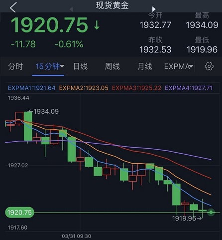 24K99讯 周四(3月31日)亚市盘中,现货黄金短线一波跳水,金价刚刚一度跌破1920美元/盎司关口。知名财经资讯网站Economies.com周四最新撰文,对日内黄金走势进行前瞻分析。