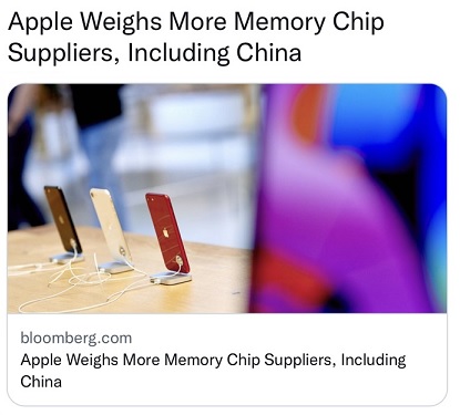 彭博报道称,苹果公司目前正在测试由中国半导体公司长江存储科技有限公司生产的NAND闪存芯片样品。