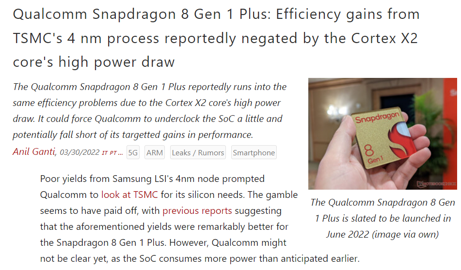 高通前二年将包含旗舰机种在内的多数机种的AP芯片代工单转投三星,因良率不甚理想加上产出不足,高通痛失市占率,而2021年底,高通遂决定在投片政策上重新调整,回到台积电,包括Snapdragon 8 Gen 1(或称Snapdragon 8 Gen 1 Plus),以及下一代旗舰平台Snapdrgaon 8 Gen 2将全由台积电代工。