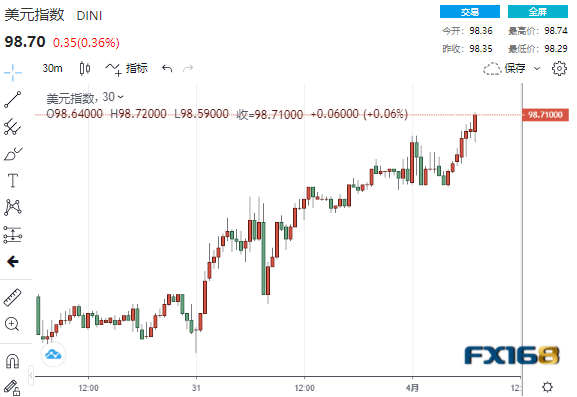 数据公布后,美元指数持续攀升,并刷新日高至98.74,较日低反弹45点。