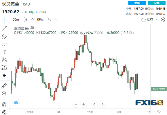 现货黄金震荡下跌至1918.57美元/盎司低点,较日高回落21美元。