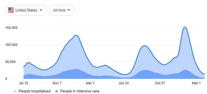 此前的新冠疫情住院人数低点出现在2021年6月。那时正值Delta变种在美成为主导之前。而住院的高点则出现在今年1月,当时全美有超过16万人同时因新冠住院。