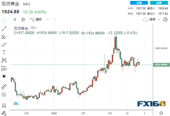 美市尾盘,现货黄金收报1924.88美元/盎司,下跌12.12美元或0.63%,日内最高触及1939.49美元/盎司,最低触及1917.82美元/盎司。本周黄金价格下跌33.09美元或1.69%。