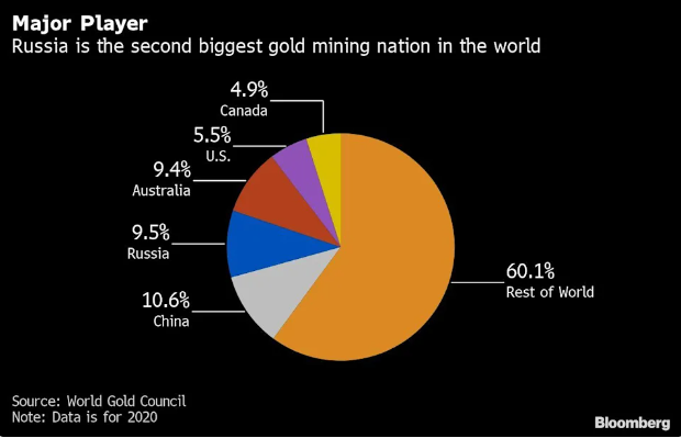 俄罗斯为全球第二大黄金生产商,而眼下,欧美市场禁止购买俄罗斯新生产的黄金,一些精炼厂也拒绝重新熔炼该国的旧金条。该国的矿商通常会把黄金卖给VTB Bank PJSC和Bank Otkritie等少数几家当地银行(大多是国有银行),然后这些银行再出口,或者直到最近几年才向央行出口。