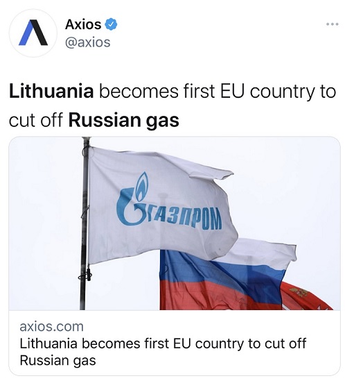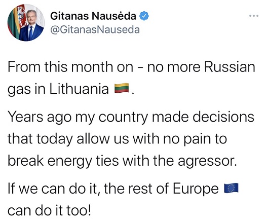 立陶宛总统瑙塞达(Gitanas Nauseda)在推特上写道:“本月开始,立陶宛不再有俄罗斯天然气。”他表示,国家正在打破与侵略者的能源联系。