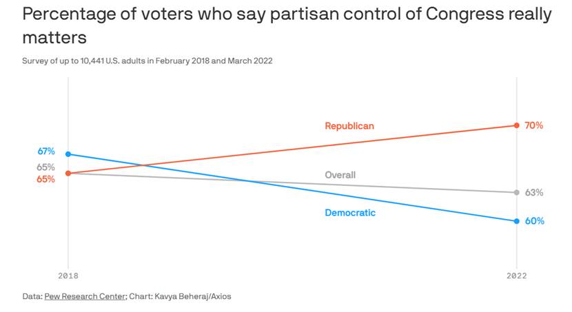 共和党选民正在表明他们对2022年中期选举的看法。皮尤研究中心(Pew Research)最近的一项调查显示,在11月之后控制国会的这一周期中,共和党选民更有动力。
