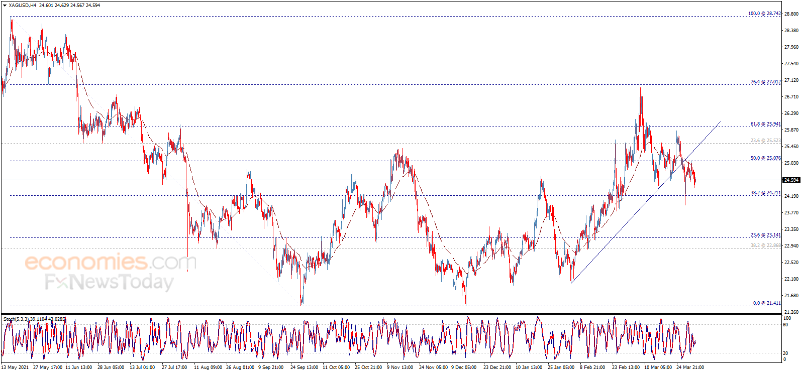 Economies.com预计,今日银价交投将位于支撑位24.20美元/盎司以及阻力位25.00美元/盎司之间。