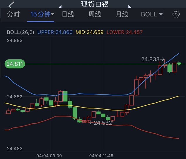 24K99讯 周一(4月4日)欧市盘初,现货白银短线大幅上涨,银价升至24.80美元/盎司上方。知名财经资讯网站Economies.com周一最新撰文,对日内白银走势进行前瞻分析。