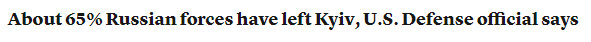 FX168财经报社(北美)讯 周一(4月4日),一名美国高级国防官员表示,驻扎在乌克兰首都基辅周围的大约2/3的俄罗斯军队已经“撤离该地区”。