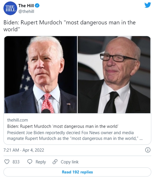 FX168财经报社(北美)讯 周一(4月4日),据纽约时报两位记者即将出版的新书报道,美国总统拜登曾谴责福克斯新闻集团(Fox News)老板、媒体大亨默多克(Rupert Murdoch)是“世界上最危险的人”。默多克是邓文迪的前夫。