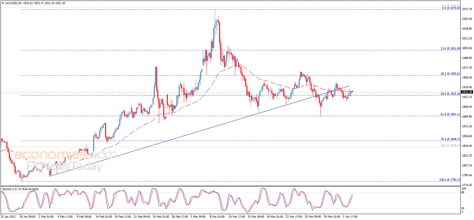 Economies.com预计,今日金价交投将位于支撑位1910.00美元/盎司以及阻力位1950.00美元/盎司之间。