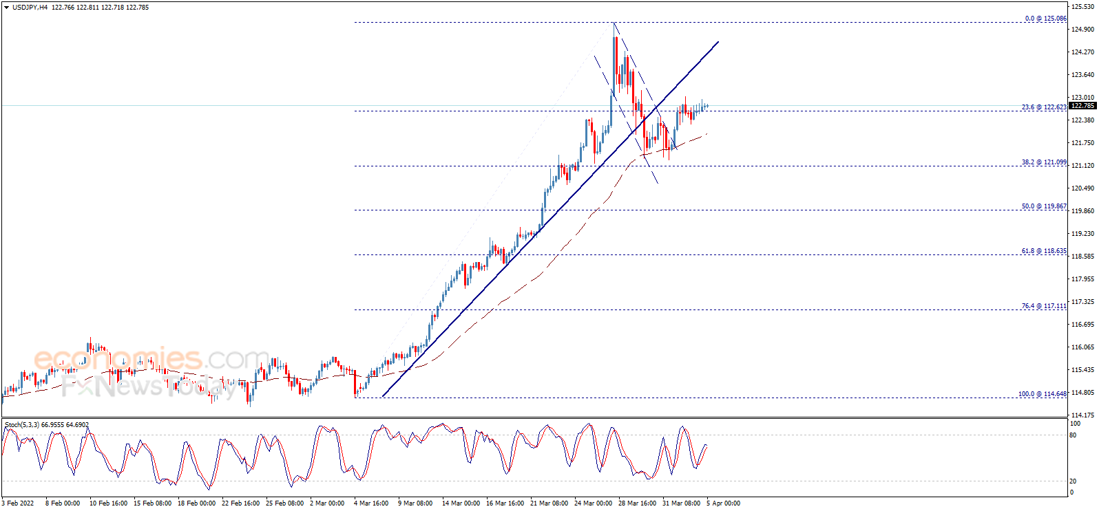从4小时图来看,EMA 50指标支持美元/日元延续升势。除非跌破122.62并保持在该位下方,否则看涨预期仍将有效。