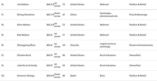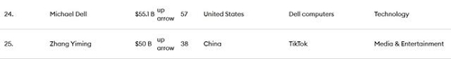 此外,农夫山泉创始人钟睒睒以657亿美元财富居第17位;字节跳动张一鸣以500亿美元财富居第25位。