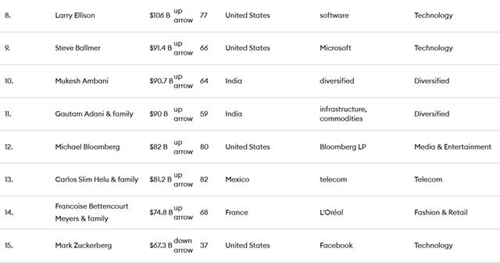 法国奢侈品巨头LVMH集团掌门人阿尔诺及家族以1580亿美元财富居第3位;微软创始人盖茨、股神巴菲特分别以1290亿美元、1180亿美元居第4位、第5位。