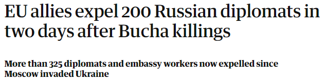 自周一以来,206名俄罗斯外交官和使馆工作人员被告知,意大利、法国、德国和其他国家的政府不再欢迎他们留在这里,这是近年来最大的外交事件之一。此外,据报道,自2月24日俄罗斯开始以入侵乌克兰以来,已有100多人被驱逐。