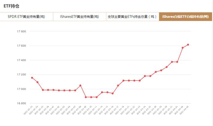 iShares白银ETF4月5日白银持有量为17615.52吨,与上一交易日增加43.09吨。