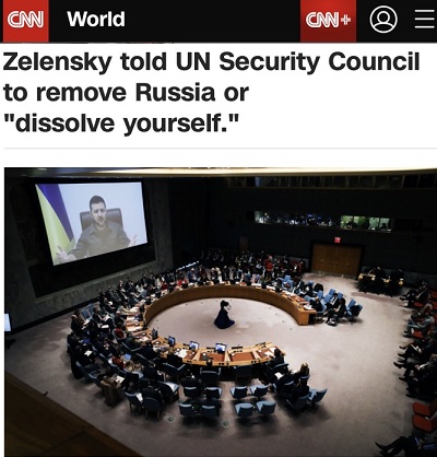 FX168财经报社(香港)讯 当地时间周二(4月5日),乌克兰总统泽连斯基(Volodymyr Zelensky)在联合国安理会通过视频发表讲话时称,他认为联合国安理会应该移除俄罗斯,并对联合国的体制进行彻底的改革。