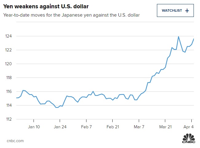 周三(4月6日)欧市早盘,美元/日元延续升势,目前已经逼近124。