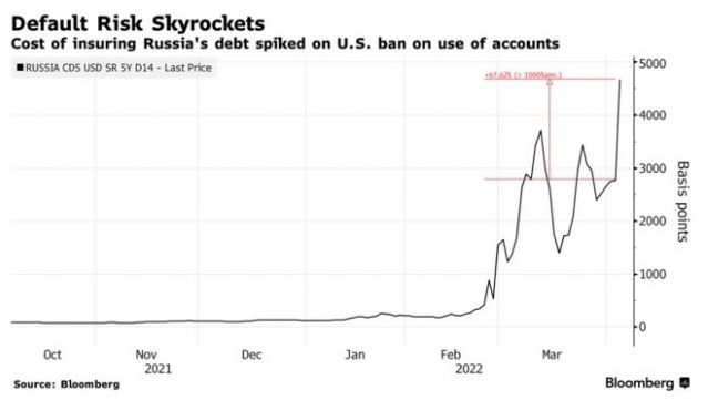 数据显示,在美国财政部停止俄罗斯政府通过在美国银行开设的账户支付美元债务后,俄罗斯违约概率已经在周一升至77.7%,在2月24日俄乌战争爆发时,该数据为24.1%。