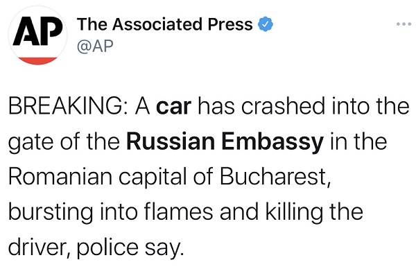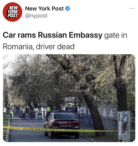 另据路透社报道,罗马尼亚警方表示,周三早上一辆汽车不明原因直接冲撞俄罗斯驻罗马尼亚大使馆大门,撞击力道之大,车头嵌入大门,还燃起大火,汽车驾驶不幸死亡。警方未公布司机身分,目前正在调查是意外还是蓄意冲撞。