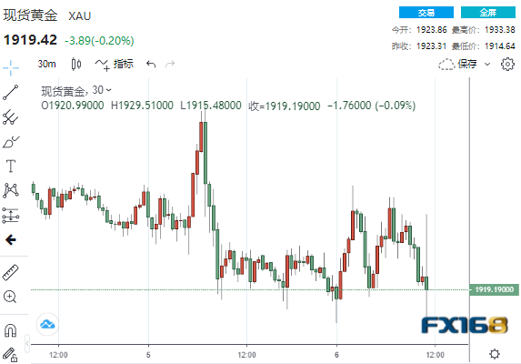 (现货黄金30分钟走势图,来源:FX168)