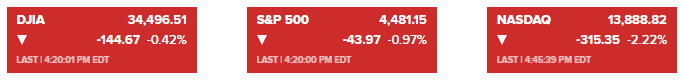 道琼斯指数下跌144.67点,至34496.51点,跌幅0.42%。标准普尔500指数下跌0.97%,至4481.15点。纳斯达克综合指数继周二下跌约2.3%后,再次下跌2.22%,至13888.82点。