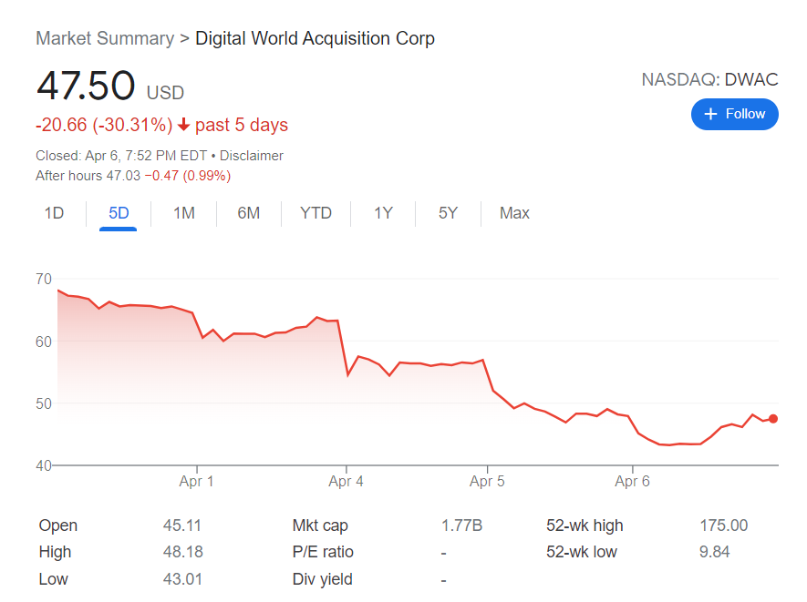 FX168财经报社(香港)讯 美国前总统特朗普此前为对抗推特与脸书,选择快速推出自创媒体Truth Social并积极宣传。但现如今随着特斯拉首席执行官马斯克入股推特董事会,并且强调言论自由的重要性,使得特朗普新发明恐将沦为泡沫,使得概念股DWAC美股股价近5日暴跌30.31%。