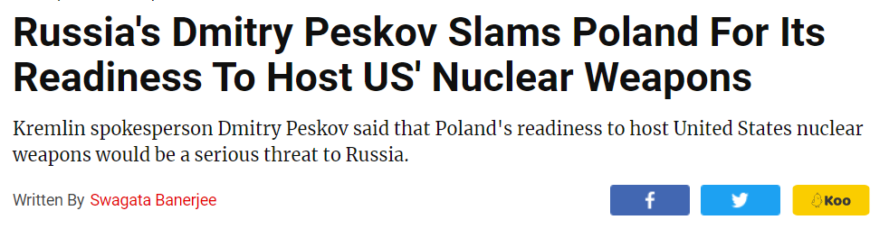 佩斯科夫在接受法国第一电视台(LCI Television)采访时指出说:“美国在波兰部署核武器会对俄罗斯造成巨大威胁,是的,俄罗斯的核力量足以抵消在波兰部署新的核武器,因此问题在于军力平衡。一方面会失衡,另一方面需要制衡。”佩斯科夫全程使用英语谈话,直播过程中被翻译成法语。