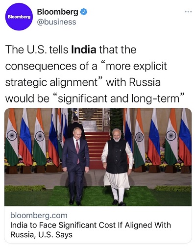 迪斯说,美国已经告诉印度,与俄罗斯“更明确的战略结盟”的后果将是“严重且长期的”。