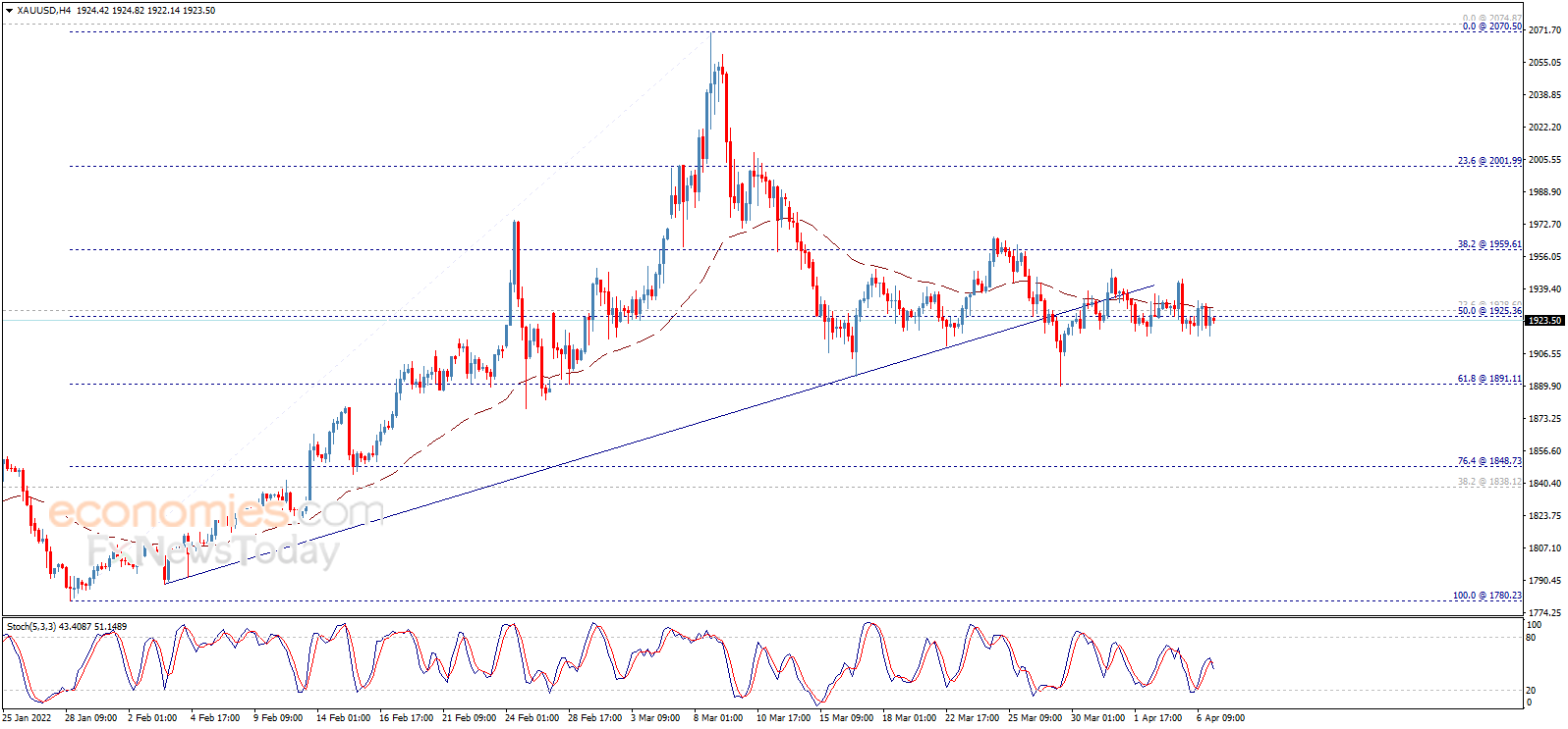 Economies.com在文章中写道,金价昨日收盘位于1925.35美元/盎司下方,值得注意的是,随机指标目前传递负面信号,此外,EMA 50指标持续对金价施压。