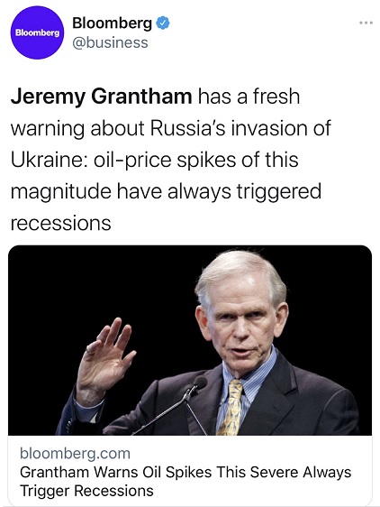 Grantham列举了一些潜在的令人不安的趋势,包括俄乌战争将导致食品价格上涨,以及渴望增长的发展中国家将导致“重复的商品繁荣周期”。
