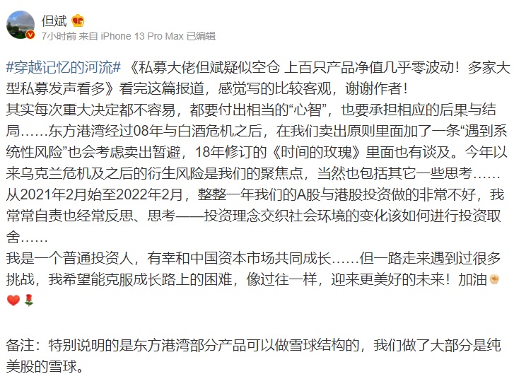 对此,但斌也在微博上通过朋友账号发声回应:好多人在议论微博被封的事,有朋友好心劝我“病从口入,祸从口出。古训一直还管用。”其实,我已经很小心,看我微博,大都是转发,很少说话。这次微博被关禁闭180天,也被明确告知是因转发了一篇问题文章有关,看样子以后转发也要谨慎了。至于这次仓位变化,也是记者关注到从1月中旬开始,我们这两个月净值变化比较小,记者来电,我以为是送快递的,才接,因为订了快递,平时我不接陌生人电话。记者一写就由他们了……另外经过 08 年的金融危机和 13 年的白酒危机之后,东方港湾的买卖原则,在原有基础上增加了针对“系统性风险”的规避原则。2015 年是在5000点、2018 年5月左右,我们都在市场大幅调整的非常早期的阶段做出了正确的风控,为投资人有效的规避了损失。本轮局势下,我们也在 1 月中旬,考虑到乌克兰危机的衍生影响……对大部分仓位做了减持的处理,当时大盘还在3600点到3500之间震荡徘徊,和最近3月以来的下跌一点关系都没有,当时,主要的原因也是考虑到今年来新增加的重重挑战, 对于投资来讲,风险度在急剧攀升,我们做出了保护资金轻仓的决定。