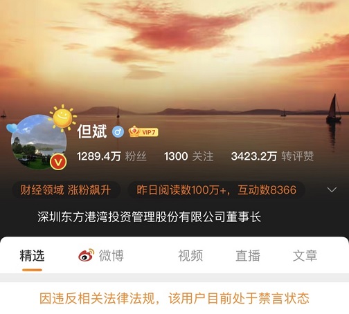 FX168财经报社(香港)讯 4月6日,深圳东方港湾投资管理股份有限公司董事长但斌的微博显示“因违反相关法律法规,该用户目前处于禁言状态”。据了解,但斌微博将被禁言180天,也就是长达半年。此前,有媒体报道称但斌旗下的上百只产品疑似空仓或轻仓运行,该报道在业内引起广泛讨论。但斌于1992年开始证券、期货研究与投资生涯,曾为君安研究所及国泰君安研究所研究员,曾因重仓茅台而一战成名。