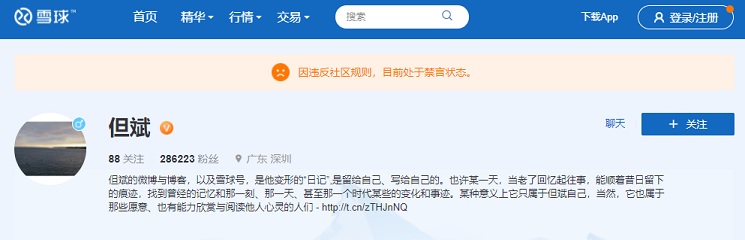 最新消息显示,但斌雪球账号也被禁言。“因违反社区规则,目前处于禁言状态。”