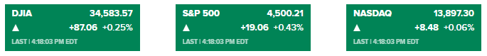 道琼斯指数上涨87.06点,至34583.57点,涨幅0.25%,盘中一度下跌300点;标准普尔500指数上涨0.43%,至4500.21点;纳斯达克综合指数在连续两天下跌后小幅上涨0.06%,至13897.30点。