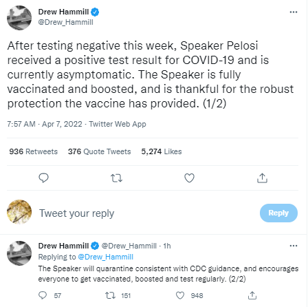 2021年7月,佩洛西的一名高级发言人曾在完全接种新冠疫苗后感染新冠病毒。
