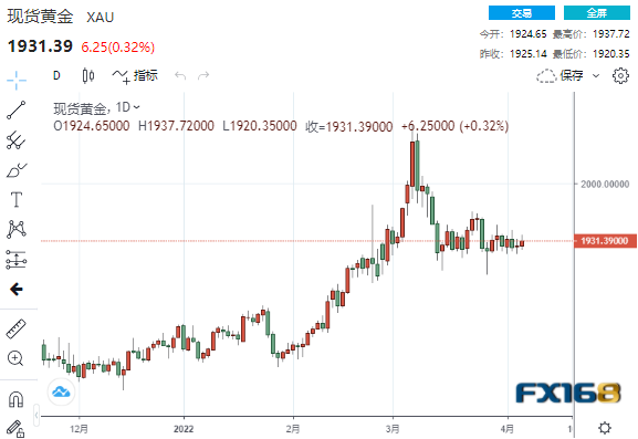 美市尾盘,现货黄金收报1931.39元/盎司,上涨6.25美元或0.32%,日内最高触及1937.72美元/盎司,最低触及1920.35美元/盎司。